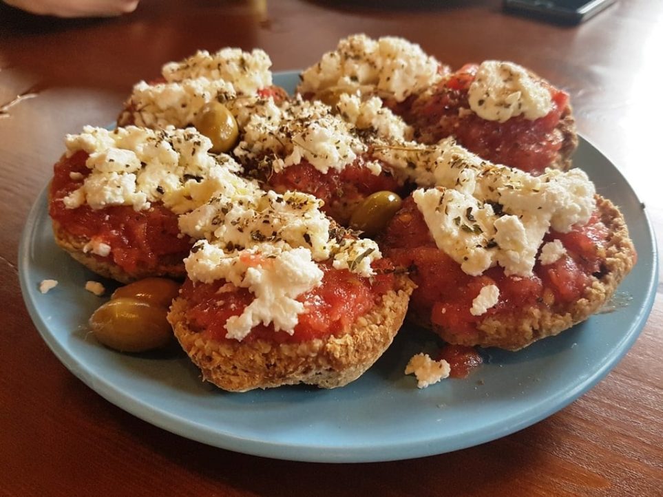 Traditional Cretan barley rusk topped with tomato, myzithra cheese, oregano, and olive oil. A simple yet flavorful dish, perfect for summer meals.